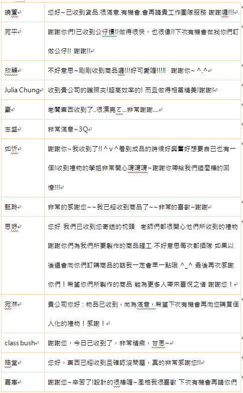 謝謝您()製作的公仔,所贈送的國外朋友們均非常喜歡並且驚嘆你們的技術可以把神情做的如此相像。--先生